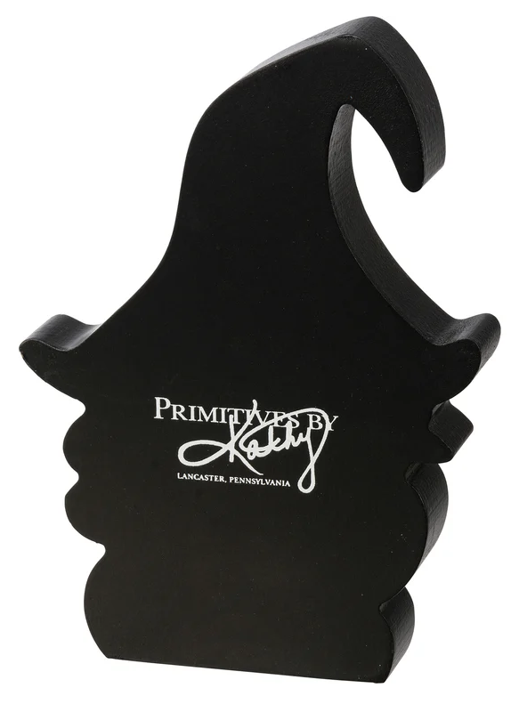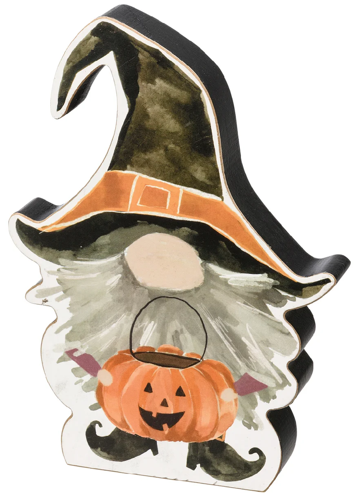 A wooden chunky sitter featuring a gnome shape with a witch hat. The design shows a gnome holding a pumpkin trick-or-treat bucket. This Gnome Trick Or Treater chunky sitter is designed to free-stand alone on any flat surface.