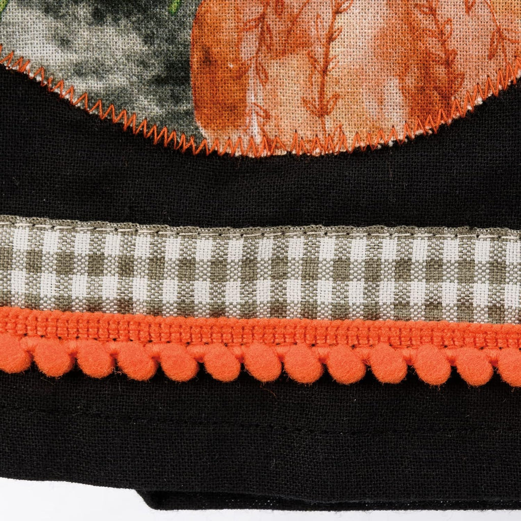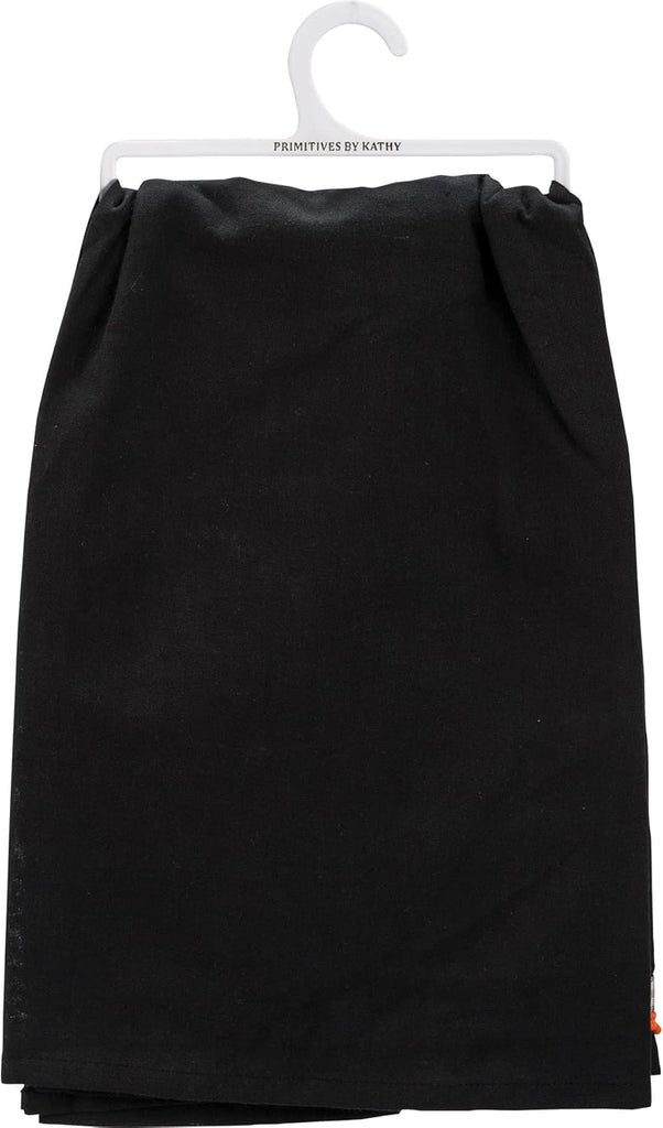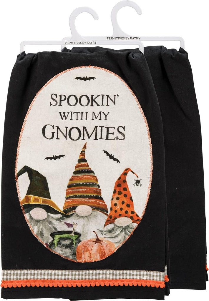 A black cotton kitchen towel with a stitched art panel. Features watercolor artwork including Halloween gnome, bat, pumpkin, and cauldron designs with hand lettered "Spookin' With My Gnomies" sentiment. Includes a gingham ribbon and pom trim. This Spookin' With My Gnomies kitchen towel is machine-washable.
