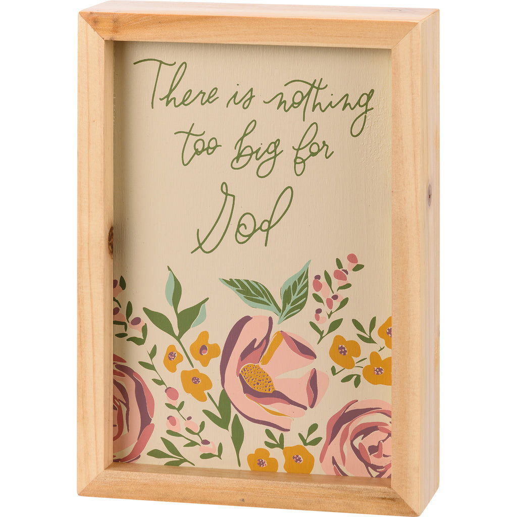 An inset wooden box sign featuring "There Is Nothing Too Big For God" sentiment, colorful floral designs, and natural wood sides for added interest. Our Nothing Is Too Big For God inset wooden box sign is easy to hang or can free-stand alone.