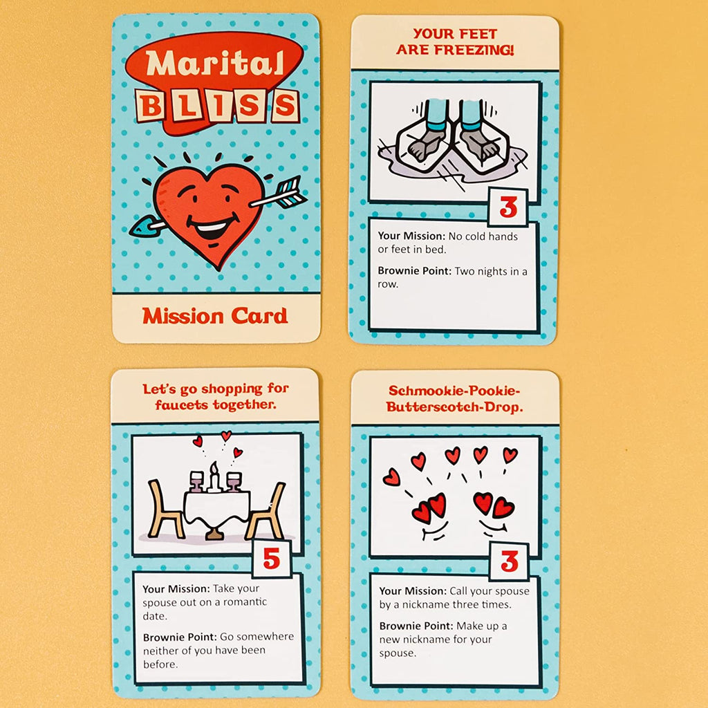 - Marital Bliss is quick to learn and easy to play, with different rules that let you choose the play style that fits your unique relationship, if a mission is guessed, it is not worth any points, better get sneaky if you want to earn that reward