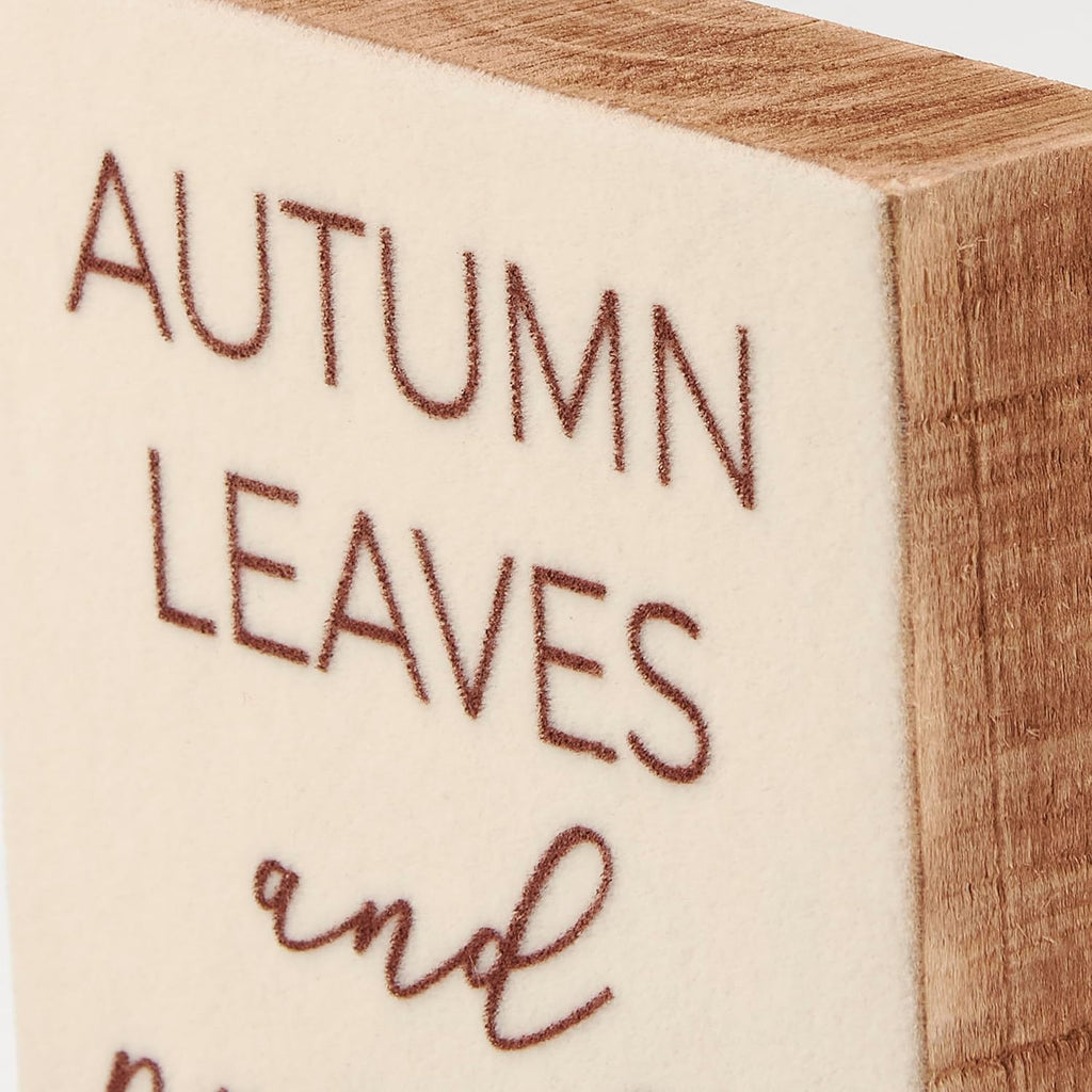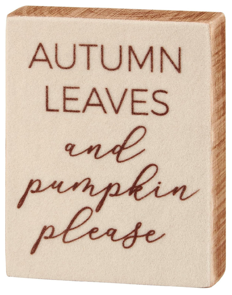 A wooden block sign from our Fall & Harvest Collection displaying a fun seasonal sentiment that reads "Autumn Leaves And Pumpkin Please." Sentiment is printed on velvet background for added texture. Seasonal block sign features coordinating natural wood on the sides and back. This Pumpkin Please sign is easy to hang via predrilled keyhole slot or can free-stand alone. A stylish seasonal home accent that can be easily displayed in any home or work space.